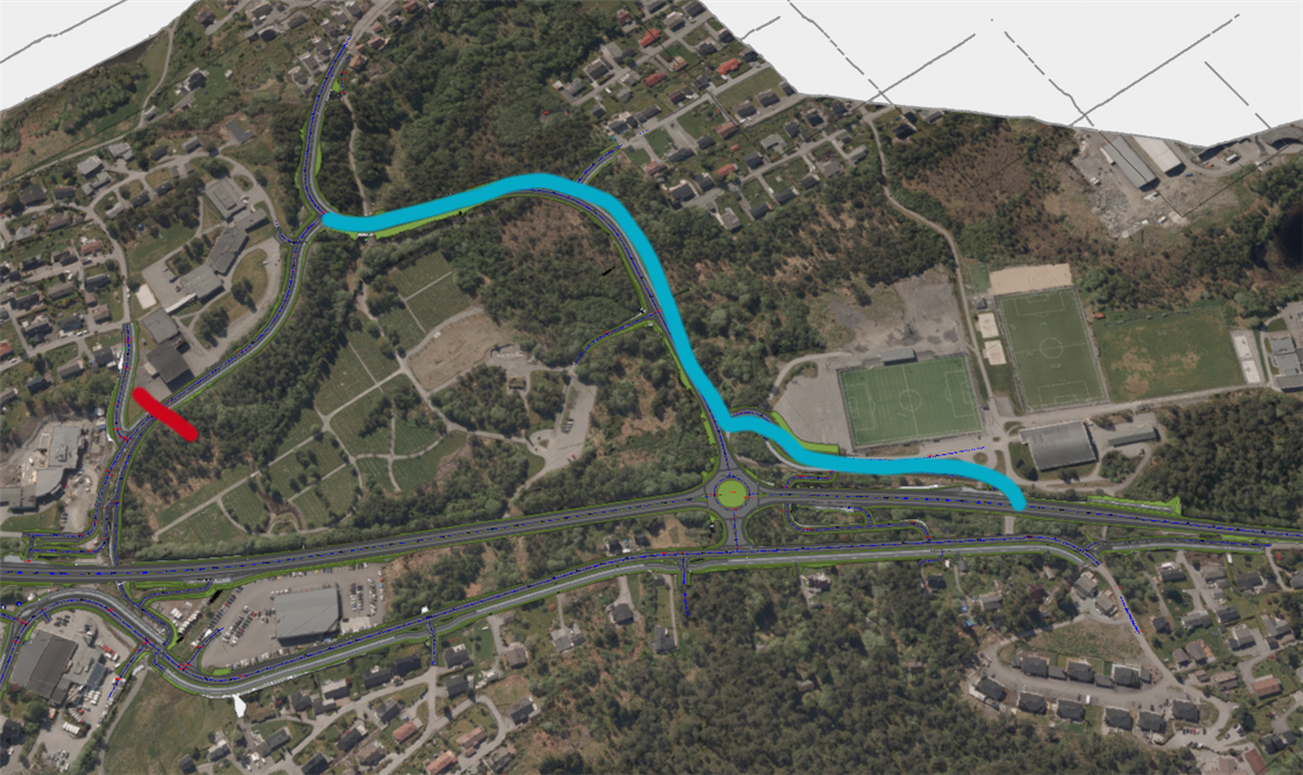 Blå strek viser ny veg. Raud strek viser kor vegen er stengt.Trafikken mellom Ramsvika og fylkesvegen vil gå via den nye vegen ved Hatleholen og Sportsvegen ved Blindheim stadion. Så snart rundkøyringa på fylkesvegen er ferdig vil gjennomgangstrafikken via Sportsvegen bli flytta til rundkøyringa.