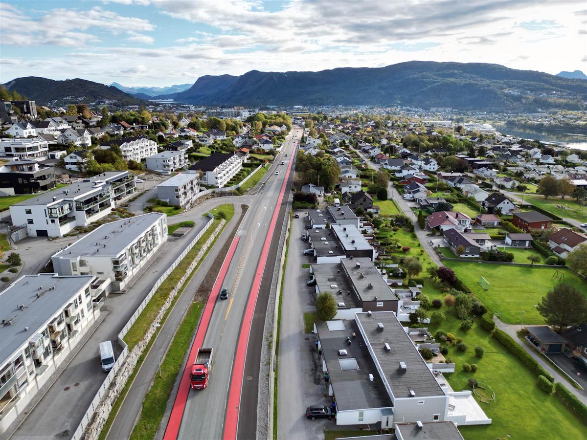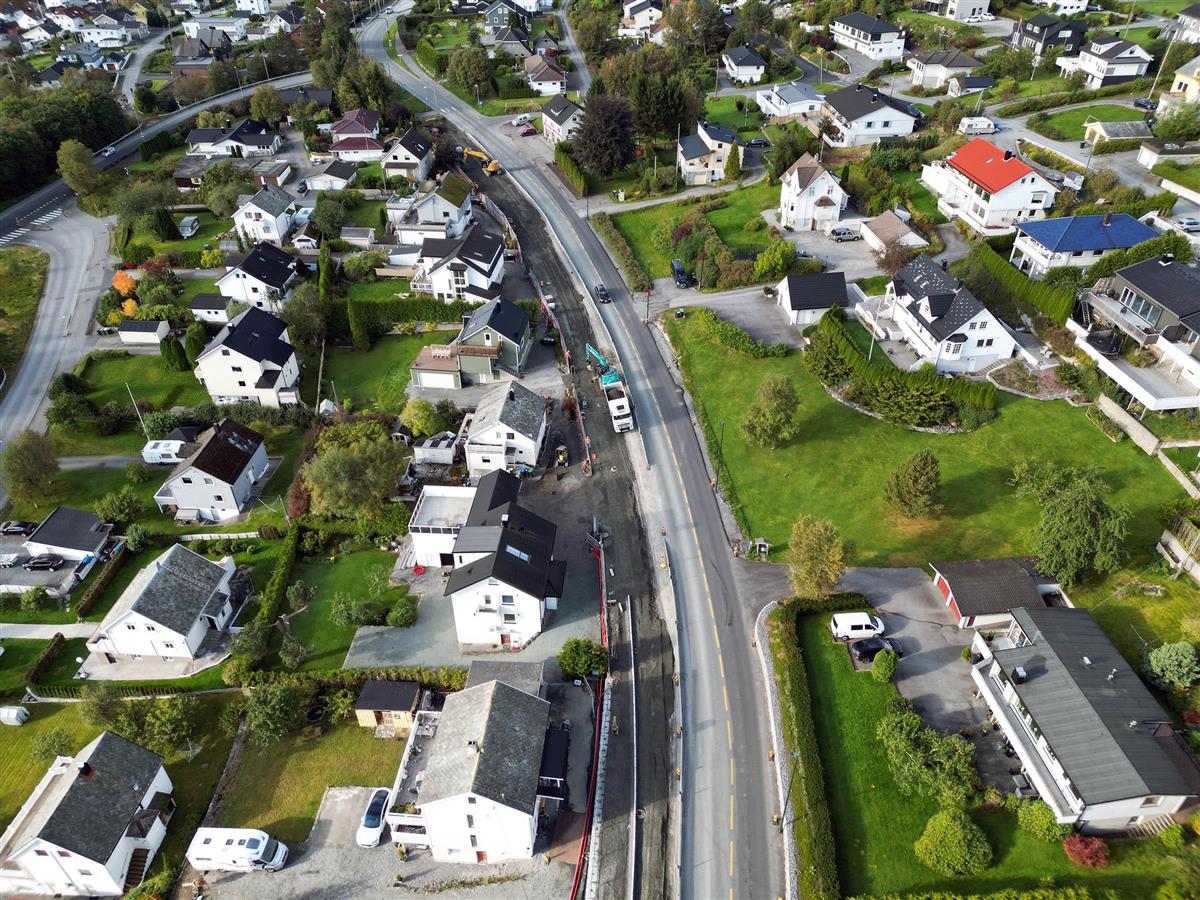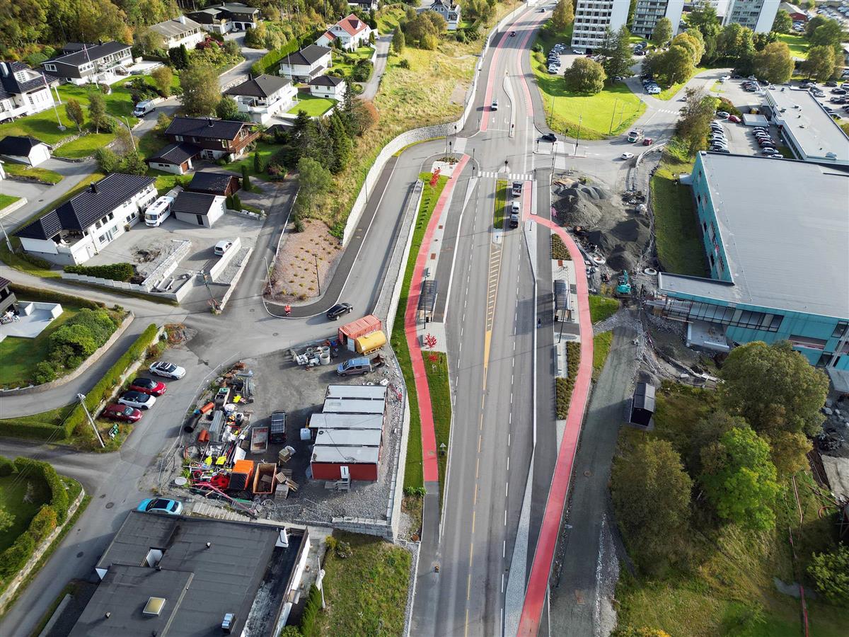 Her ser vi området frå Åsebøen og austover mot Moa, der raudt sykkelfelt er i ferd med å kome på plass.