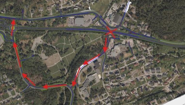 Stengt kryss er merka med raudt kryss. Dei raude pilene viser ny veg.