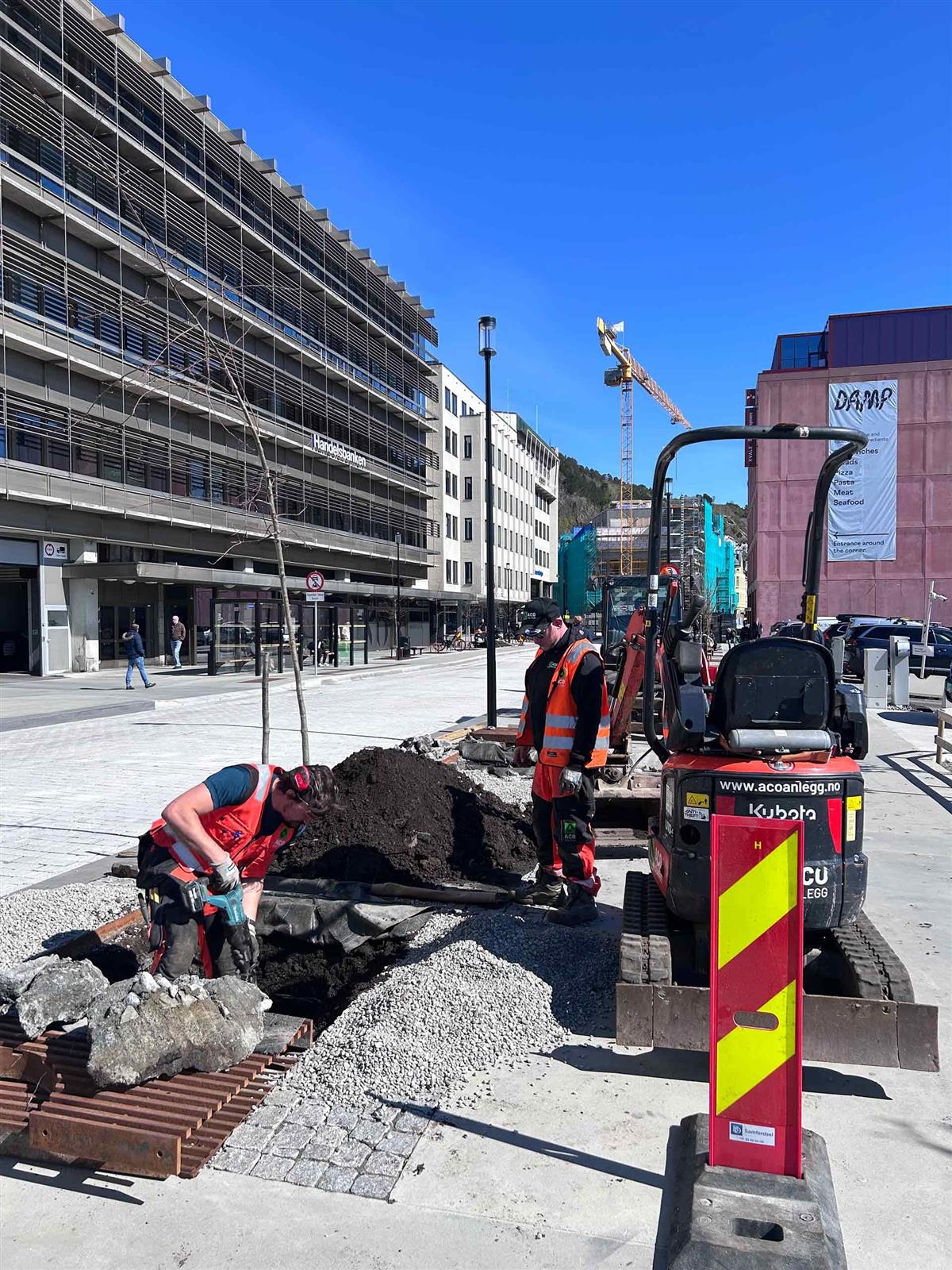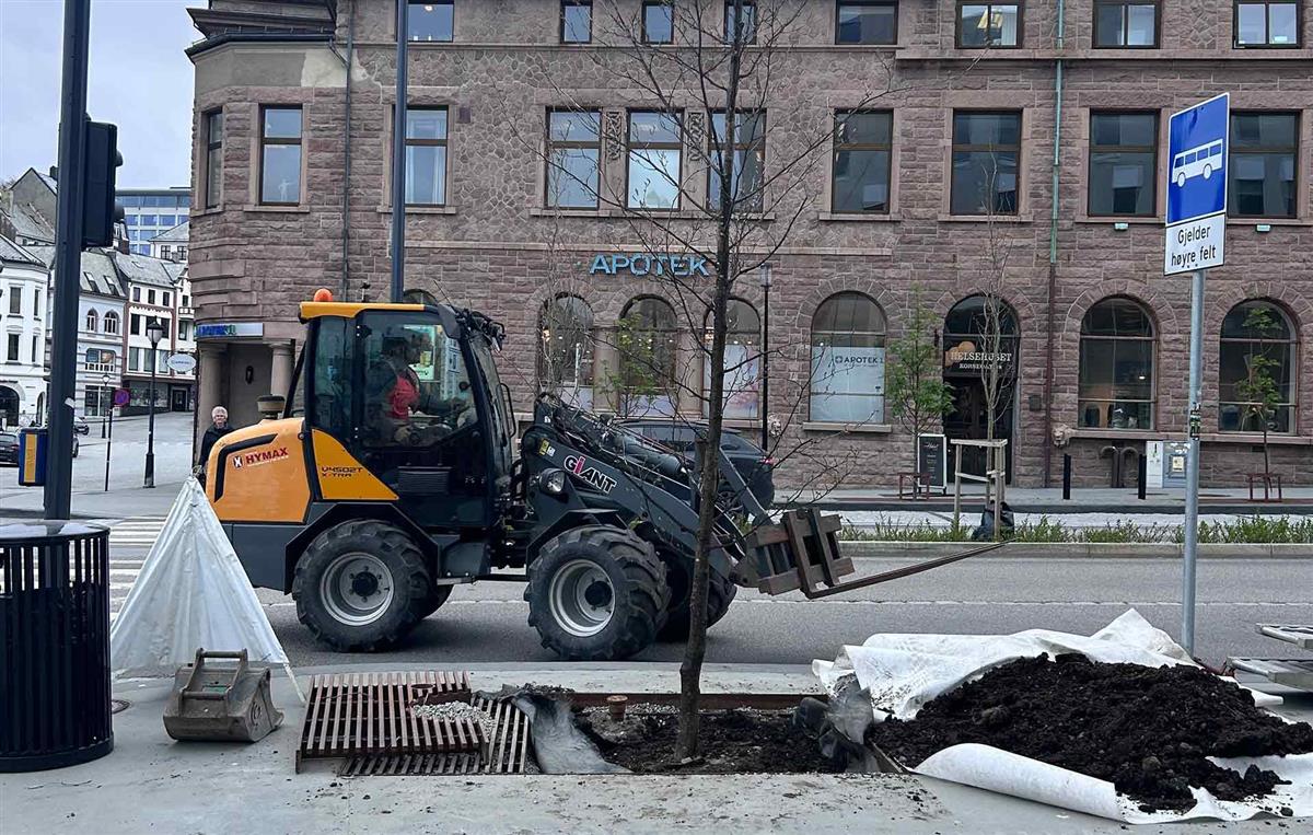 Plantane er ein viktig del av heilskapen i det nye kollektivområdet. Det er entreprenøren ACO anlegg AS som har sett ut dei nye trea, som må plantast individuelt med gravemaskin i plantekasser under bakken.